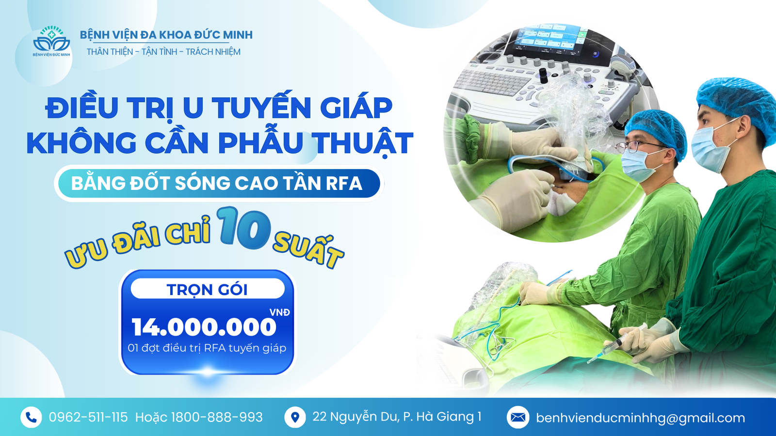 Người bệnh có BHYT, nghi ngờ hoặc đã được chẩn đoán nhân giáp lành tính, hãy liên hệ Bệnh viện Đa khoa Đức Minh để được tư vấn, thăm khám và sàng lọc chỉ định RFA sớm nhất.